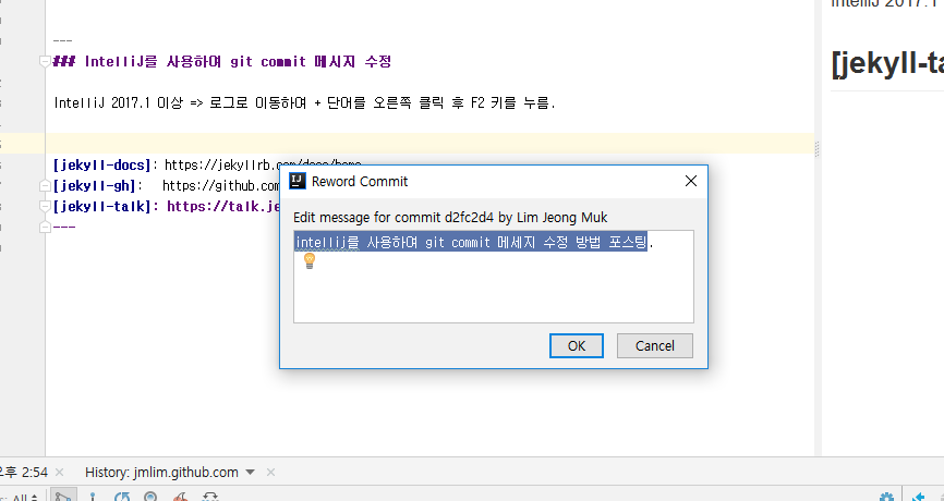 - IntelliJ 2017.1 이상 => 로그로 이동하여 + 단어를 오른쪽 클릭 후 F2 키를 눌러서 커밋메세지를 변경할 수 있다.