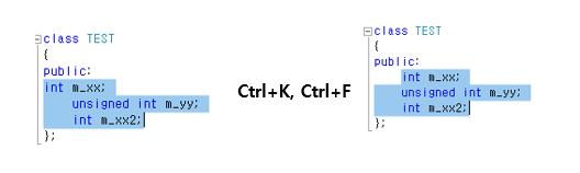 - Ctrl+K, Ctrl+F: 선택 범위의 인덴트 조정