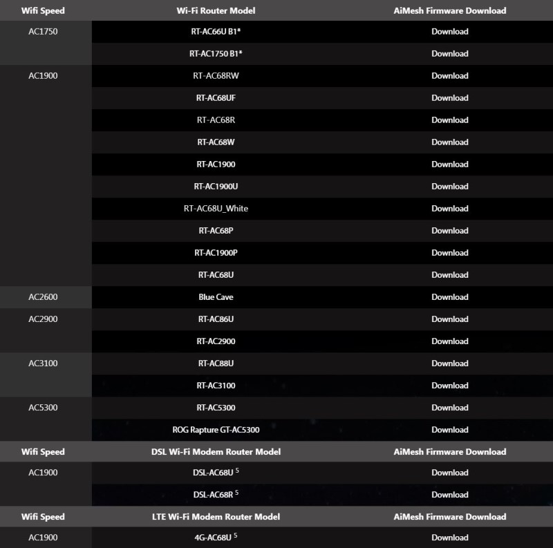 따라서, 비싸게 AC68U 정품을 사지 않아도 변신 AC68U 한대가 있으면, AiMESH NODE 모드로 써서 다른 ASUS 공유기를 연결해서 넓은 wifi 공간을 누릴 수 있죠. 잘 아시겠지만, NODE에 연결하는 공유기는 ASUS 유무선공유기 중 아래 리스트를 참고 바랍니다. AiMESH는 지원하는 펌웨어를 쓰셔야만 연결이 됩니다.