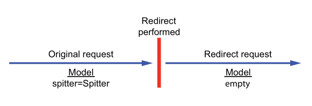 리다이렉트가 발생하면 원래 요청은 끊어지고, 새로운 HTTP GET 요청이 시작된다.(브라우저에게 이 URL로 리다이렉트해!) 때문에 리다이렉트 실행 이전에 수행된 모델 데이터는 소멸한다. 따라서 리다이렉트로 모델을 전달하는 것은 의미 없다.