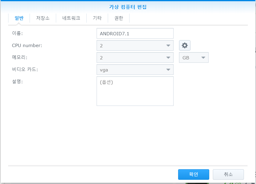 위 VMWARE의 설정치 보다는 시놀로지 자원의 여유가 더 있어서 코어갯수는 1->2 / RAM 1GB->2GB로 증가시키고 HDD는 20GB로 동일하게 설정했습니다.