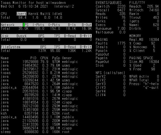 [ CPU 관련 ] * CPU 정보 확인 topas sys : 커널이 사용하는 process time slice에 대한 백분율. User : 사용자 프로그램에서 사용하는 사용율. Idle : 지금 사용되고 있지 않은 부분. Wio : 디스크에서의 응답을..