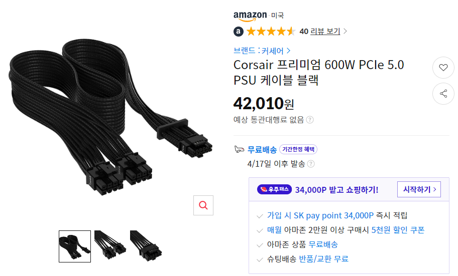 | 악세사리 | ORSAIR Premium 600W PCIe 5.0 Type-4 Sleeved Cable BLACK -> 11마존 커세어 12VHPWR 슬리빙 케이블 |