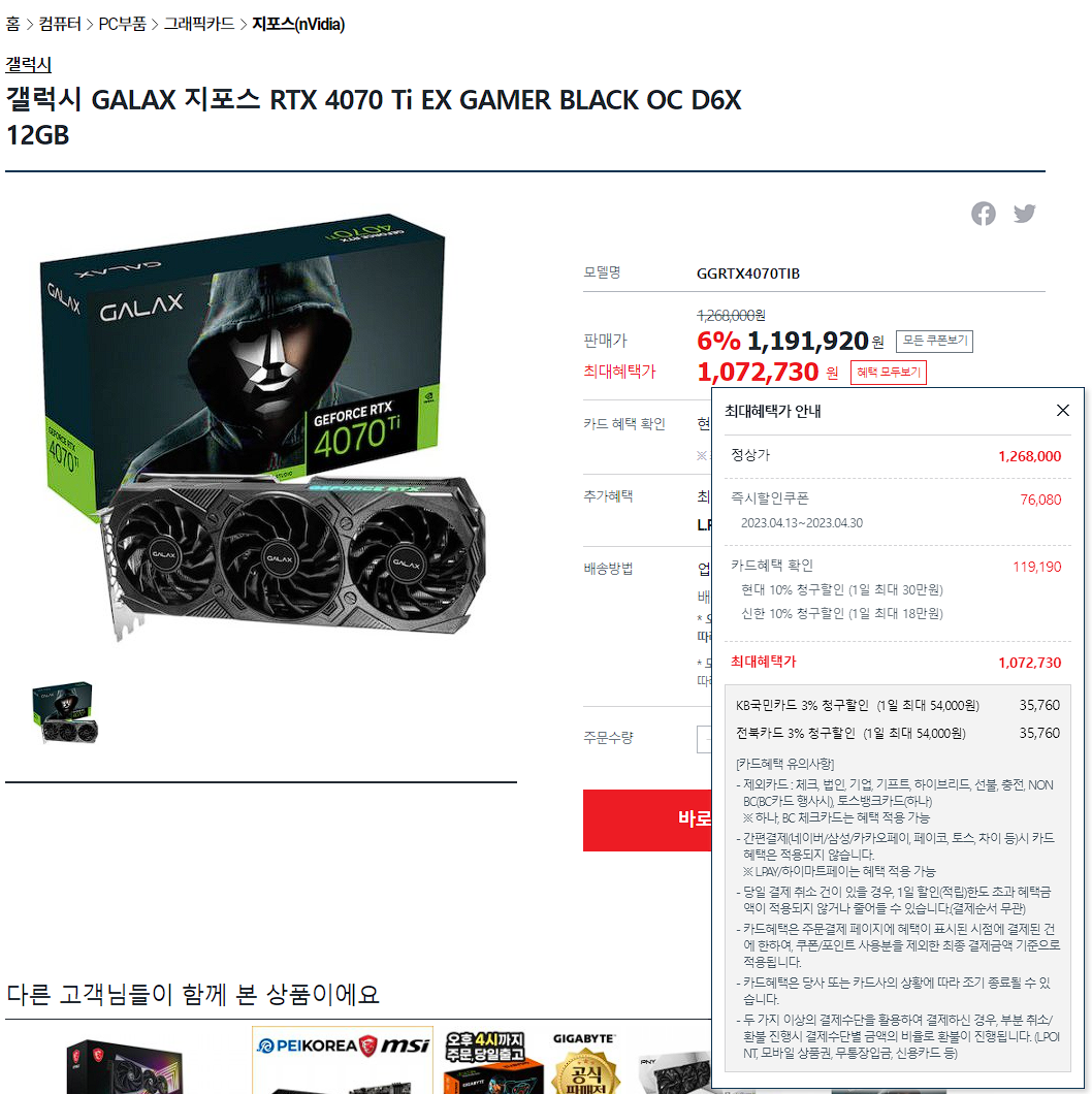 | 그래픽카드 | 갤럭시 GALAX 지포스 RTX 4070 Ti EX GAMER BLACK OC D6X 12GB -> 하이마트 현대카드10% 청구할인 + 현대카드 M포인트 3만 할인 + 택배비 포함 |