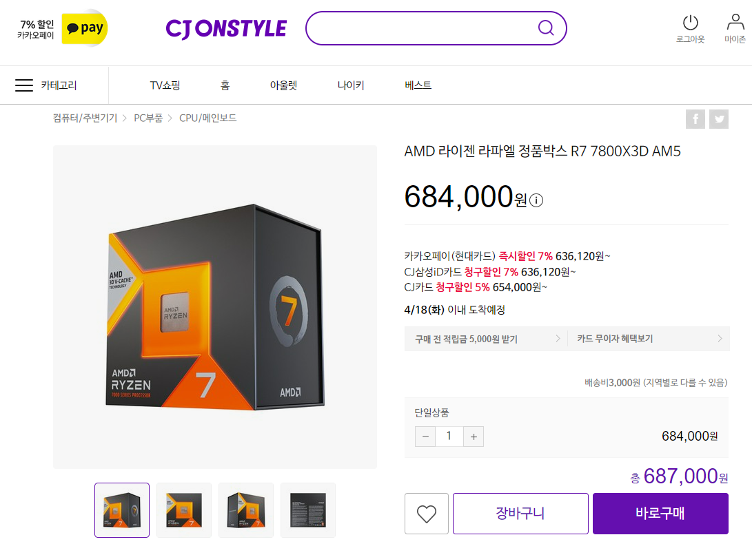 | CPU | AMD 라이젠7-5세대 7800X3D (라파엘) (정품) -> 카카오페이(현대카드) 7% 즉시 할인 + 택배비 포함 |