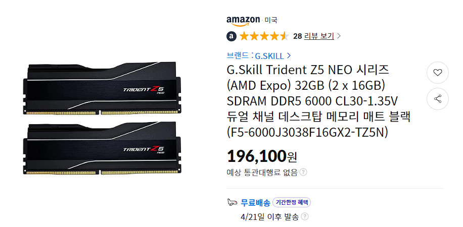 | 메모리 | G.SKILL TRIDENT Z5 NEO 32GB(16Gx2) DDR5-6000 CL30-1.35V -> 11마존 CL30 으로 주문 |