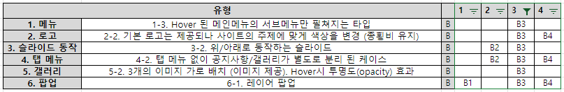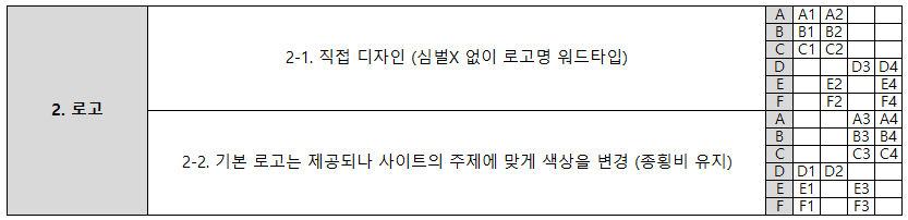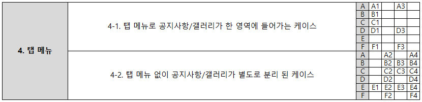 실기 유형 2024년 웹디자인 기능사 실기 유형,1,2,3,4 1. 메뉴,1-1. 서브메뉴가 모두 필쳐지는 타입,A,A1 B,B1 C D E F 1-2. 서브메뉴가 모두 펼쳐지고, 별도 배경 영역이 있는 타입,A,A2,A4 B,B2,B4 C D E F,F3,F4 1-3