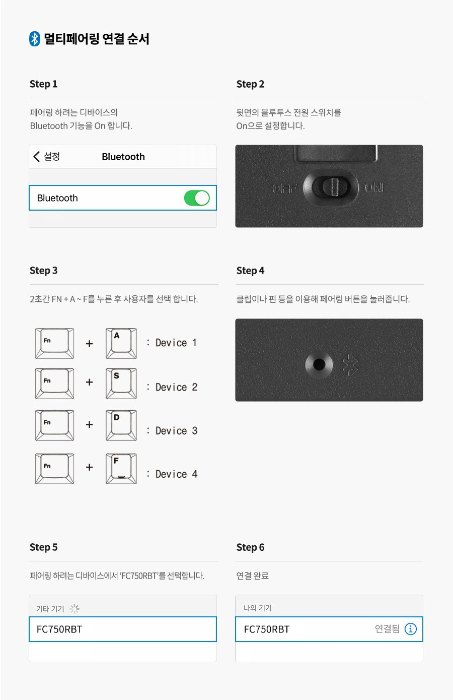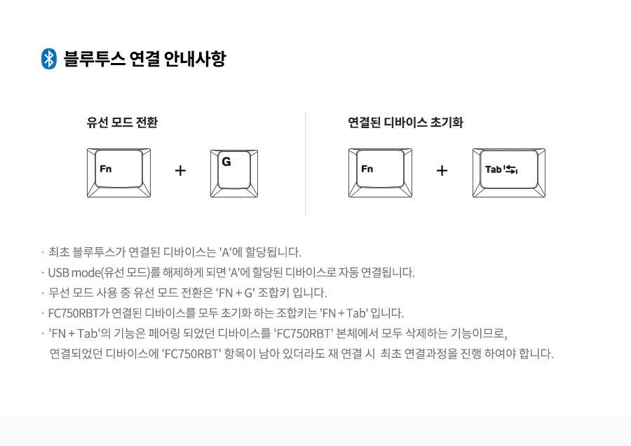 - Windows 설정 → Bluetooth 및 기타 디바이스 → 마우스, 키보드, 펜 목록에 ‘FC750RBT’ 모델이 페어링 된 것으로 표시되어 있더라도, 키보드 본체에서 정보가 이미 삭제되어 있는 경우가 있습니다.