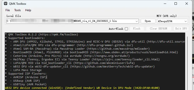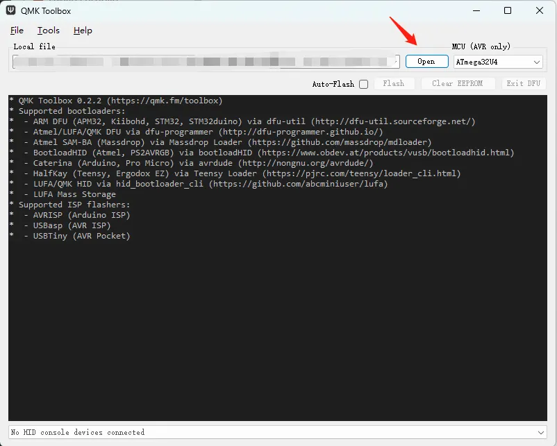 https://www.qwertykeys.com/pages/fw - QMK Toolbox에서 Open을 눌러 방금 다운로드한 .bin 파일을 선택합니다.