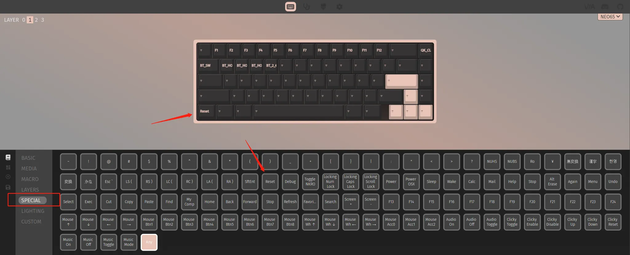- VIA 설정에서 아무 키나 'Reset' 키로 매핑합니다.