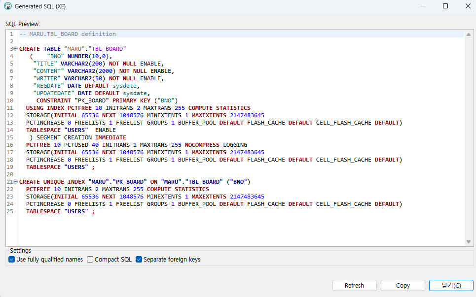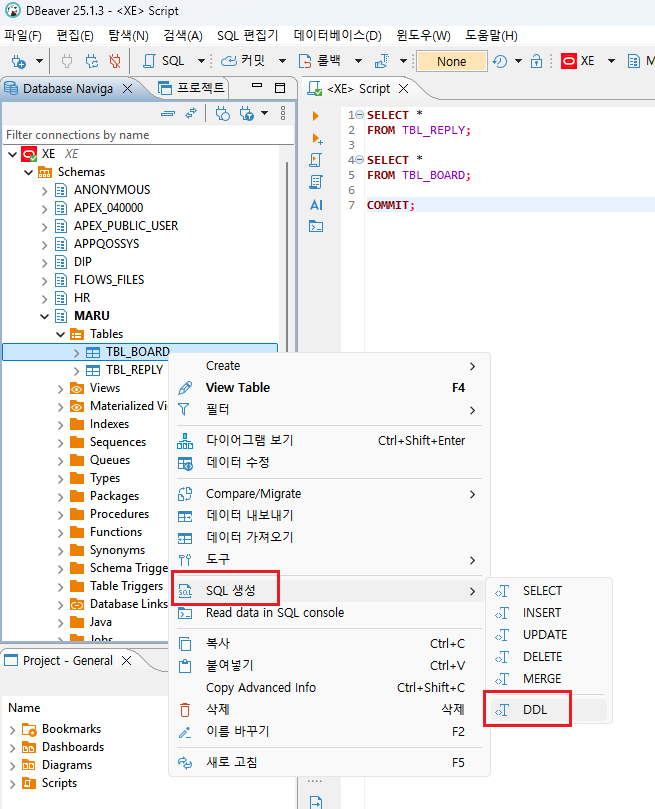 테이블 우클릭 > SQL 생성 > DDL